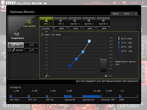 Помимо этого, для создания эффективной системы теплоотвода на плате предусмотрено пять четырехконтактных разъемов для подключения вентиляторов (включая и вентилятор кулера процессора). Традиционно, скорость любого корпусного вентилятора и вентилятора кулера процессора можно настраивать через UEFI BIOS.