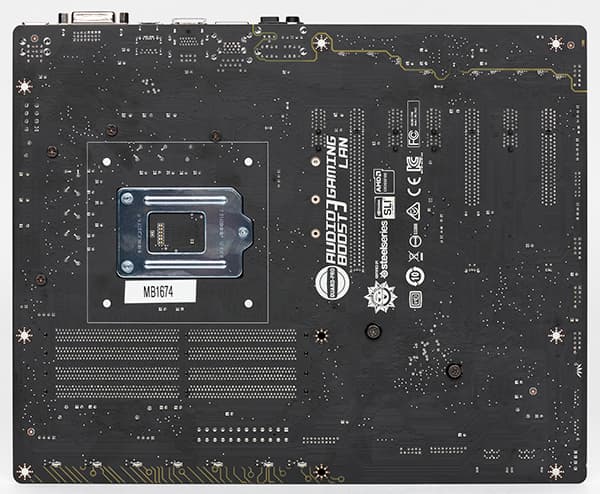 С одного края платы (там, где находится разъем питания) с обратной стороны имеется семь светодиодных индикаторов, расположенных в линию. С использованием утилиты MSI Gaming App можно настраивать цвет этих индикаторов и даже выбирать схему из свечения (постоянное свечение, дыхание, радуга и т. д.). На лицевой стороне платы в том месте, где расположены индикаторы подсветки, имеется ряд полупрозрачных полосок, которые имитируют проводники на текстолите платы. И эти проводники получаются также подсвечиваемыми. Правда, эта подсветка довольно тусклая и хорошо заметна лишь в темноте.