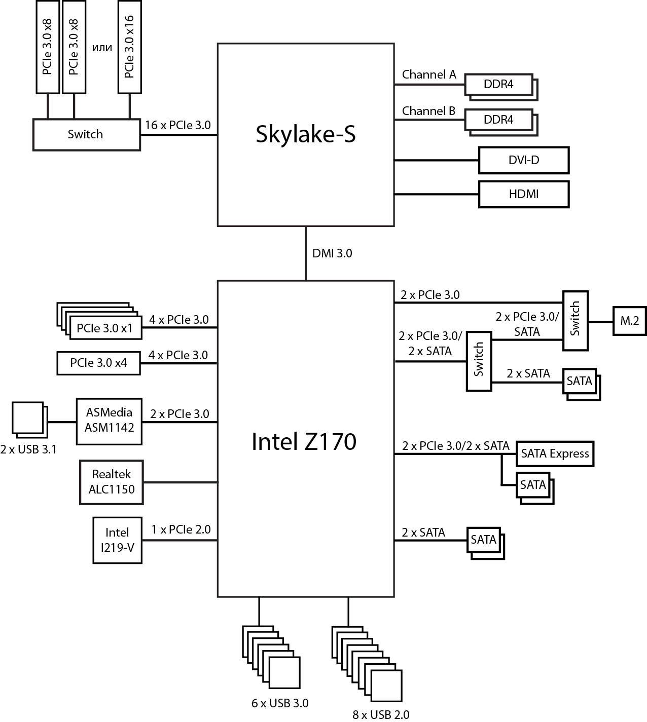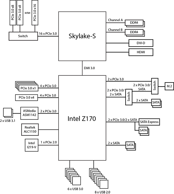 Напомним, что чипсет Intel Z170 имеет до 20 портов (линий) PCI Express 3.0, до 10 портов USB 3.0 и до 6 портов SATA 6 Гбит/с. При этом всего может быть не более 26 высокоскоростных портов (PCIe, USB 3.0 и SATA 6 Гбит/с), причем к 20 портам PCIe 3.0 одновременно можно подключить не более 16 PCIe устройств (контроллеров, разъемов и слотов) с учетом того, что одно устройство может задействовать один, два или четыре порта PCIe.