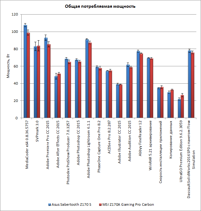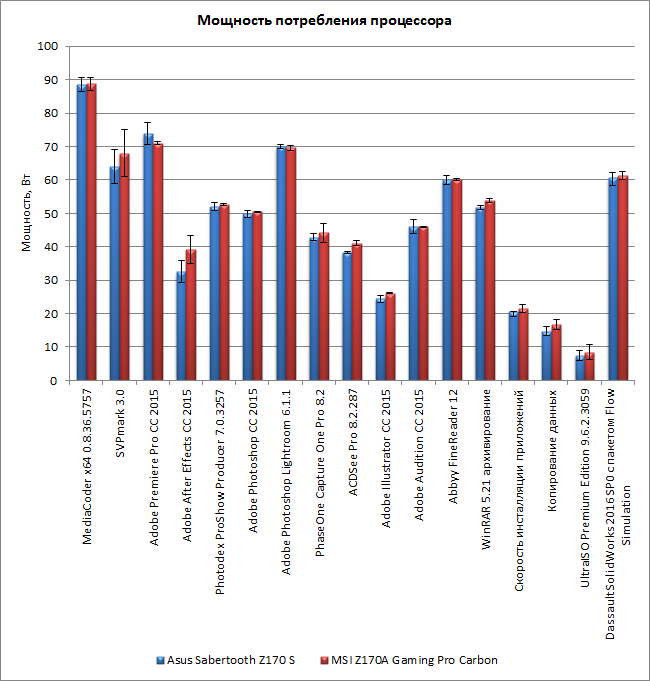 С энергопотреблением процессора и системы в целом ситуация совершенно аналогичная. Результаты измерения для плат MSI Z170A Gaming Pro Carbon и Asus Sabertooth Z170 S отличаются друг от друга в пределах погрешности.