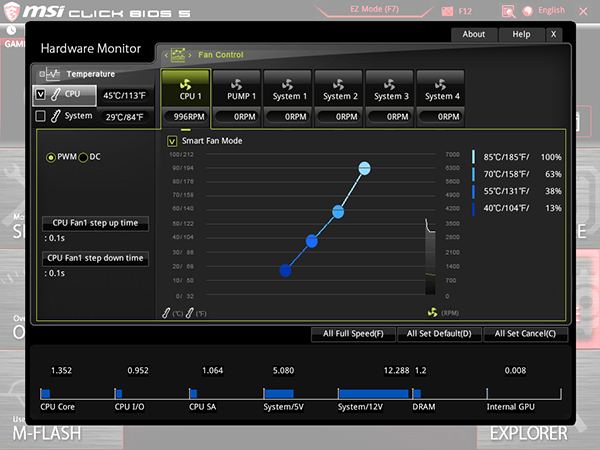 Подраздел Hardware Monitor предназначен для контроля температуры процессора процессора и системы, скорости вращения подключенных вентиляторов и напряжений. Кроме того, в этом же подразделе можно настроить скоростной режим вентиляторов по четырем точкам на графике зависимости скорости вращения от температуры процессора или системы. Причем производимые изменения сразу же вступают в силу.
