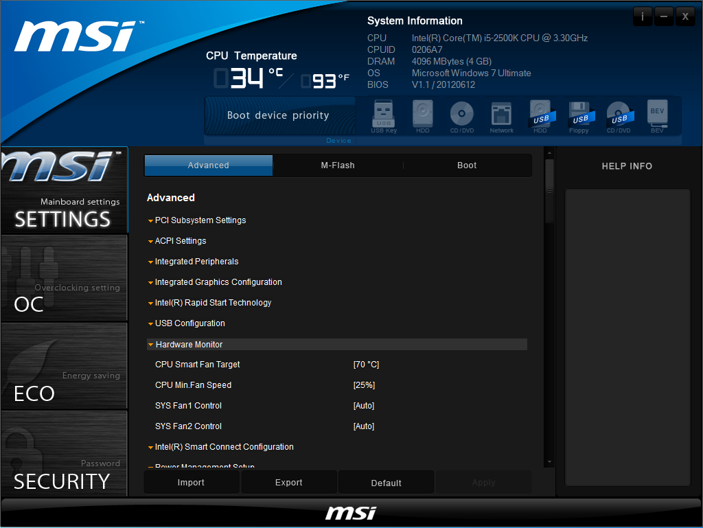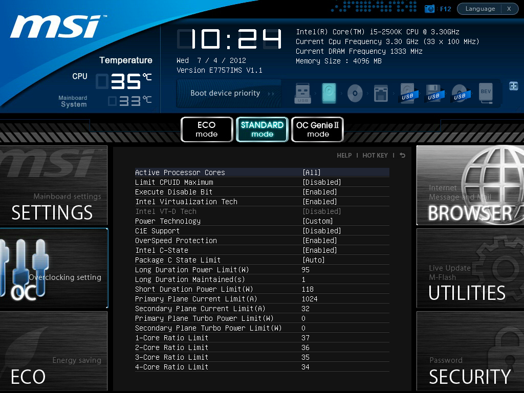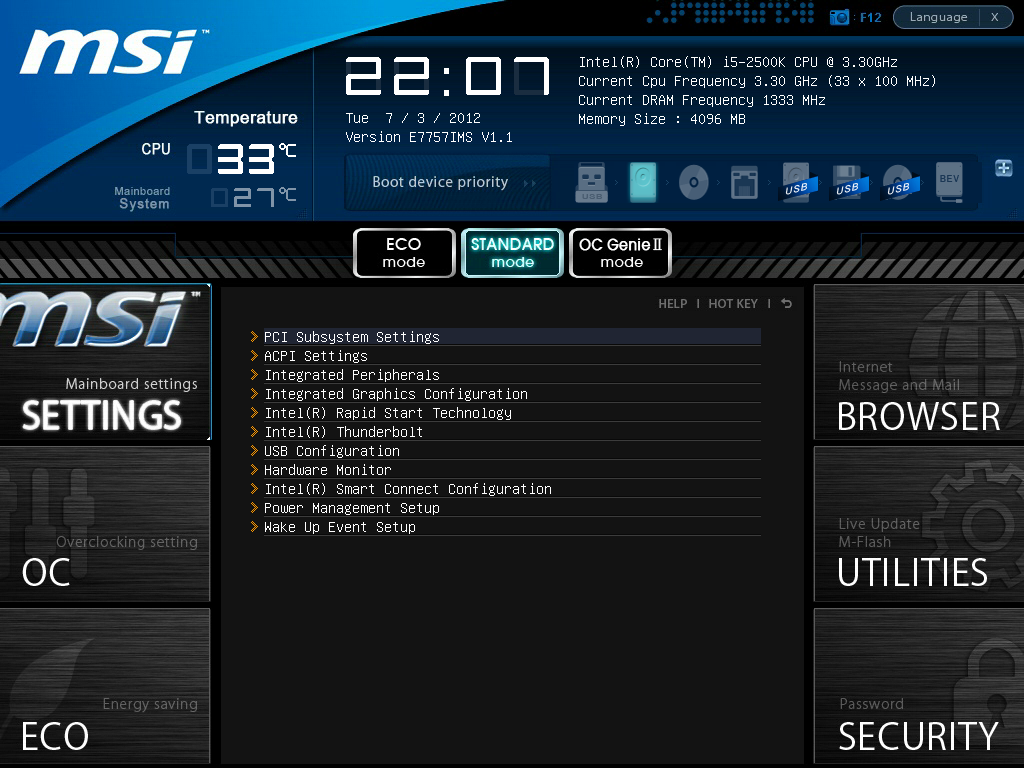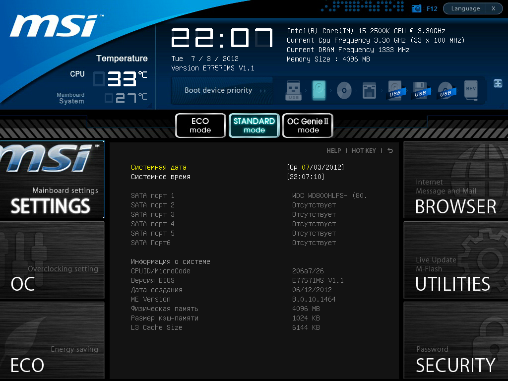 Есть несколько «горячих клавиш», встроенная (в большинстве случаев очень краткая) справка по настройкам, возможность записи скриншотов на USB-накопитель. В верхней части экрана представлена информация о процессоре и оперативной памяти, температура процессора и платы, дата и время, загрузочные устройства (с возможностью выбора). Ниже находятся шесть больших инокок для перехода к настройкам и другим функциям: