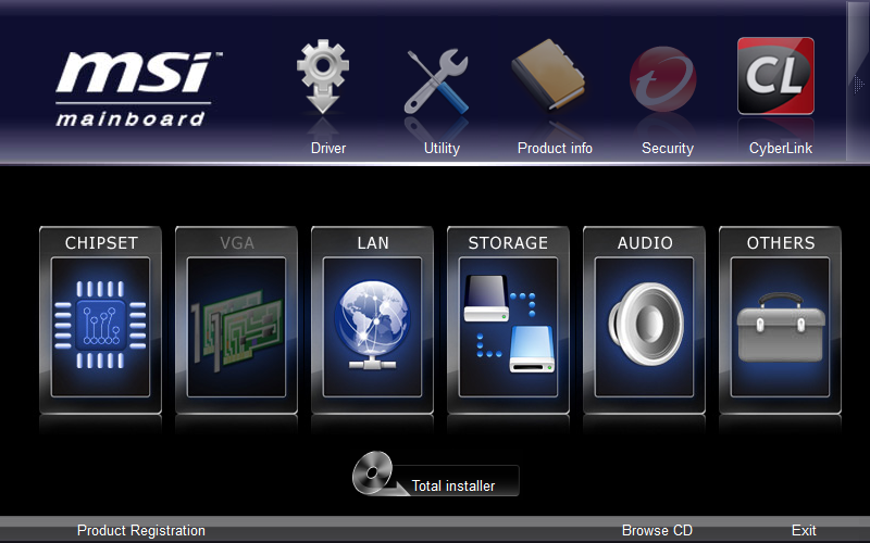 На DVD-диске (судя по всему, это универсальная версия для нескольких плат) находятся объединенные в красивую оболочку необходимые драйвера, программы и демо-версии продуктов Adobe, Cyberlink, Norton, Trend Micro и других компаний.