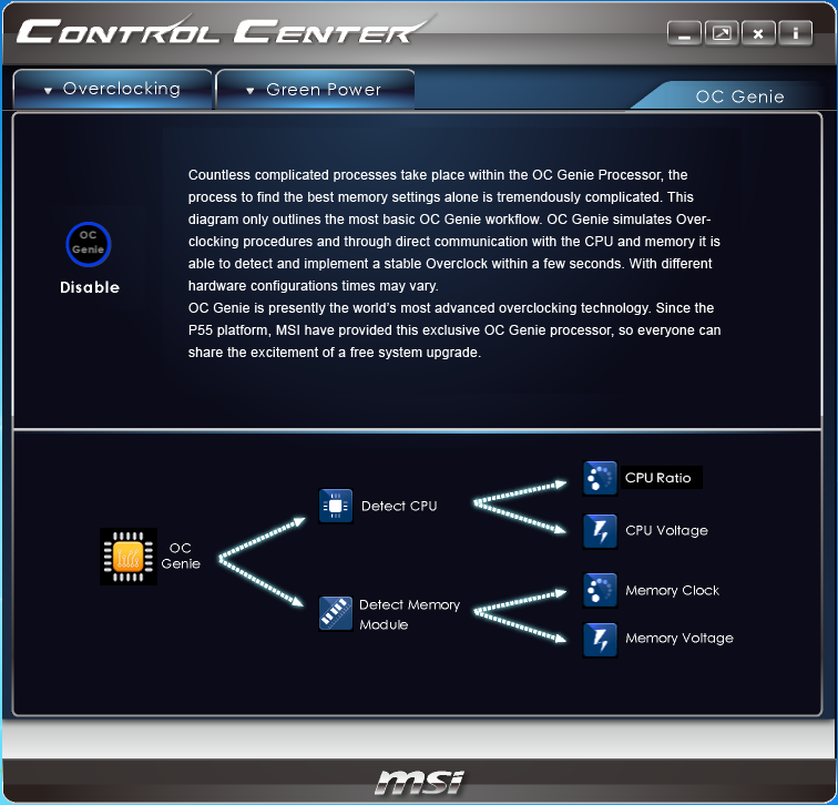 Не секрет, что многие современные процессоры Intel имеют неплохой запас по частоте. MSI предлагает использовать функцию OC Genie II для быстрого автоматического разгона системы. Интересно, что в рекламных материалах заявлено, что она справляется со своей задачей за одну секунду.