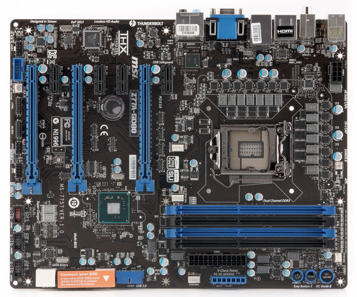 Компания MSI давно входит в плотную группу лидеров рынка материнских плат. На чипсетах седьмой серии больше всего она выпустила моделей с максимальной версией — Z77. Из шести представленных материнских плат сегодня мы рассмотрим самую дорогую — Z77A-GD80. Ее наиболее яркими ключевыми особенностями являются поддержка трех графических слотов, наличие контроллера Thunderbolt, мощная схема питания с высококачественными компонентами и расширенные функции разгона системы.