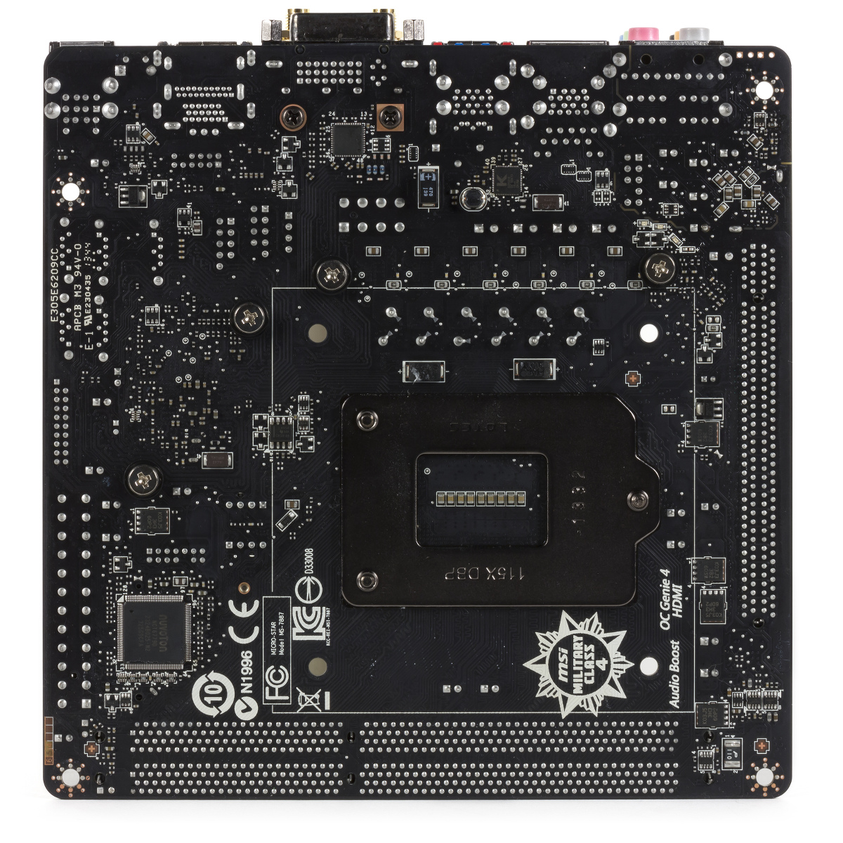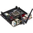 Материнская плата имеет стандартные для Mini-ITX размеры 170×170 мм. Крепление к корпусу осуществляется на четыре винта. Цветовое оформление платы соответствует серии — черный текстолит, черные разъемы и только немного красного на радиаторах. Жаль, что беспроводной адаптер немного нарушает стиль со своим традиционным зеленым текстолитом. На плате нет никаких светодиодных индикаторов. Но есть красная подсветка с обратной стороны платы под звуковым контроллером.