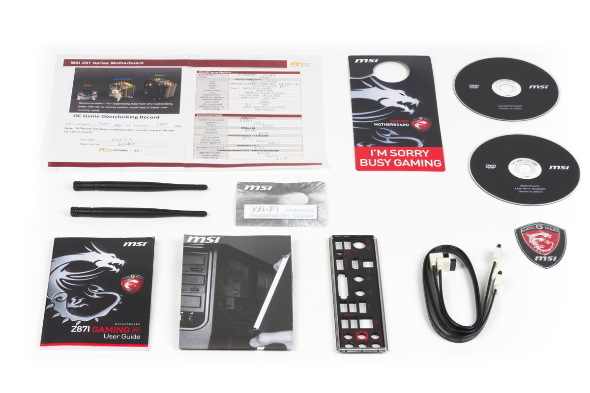В комплект поставки материнской платы входит заглушка на заднюю панель корпуса (с черным фоном и красными надписями), два кабеля SATA (на каждом кабеле один из разъемов — угловой, все разъемы имеют защелки), две внешние антенны для встроенного контроллера Wi-Fi, два диска с драйверами и программами, краткая универсальная листовка по установке и подключению на нескольких языках, печатное руководство для данной модели платы на английском языке, наклейка «Gaming Series», табличка на дверную ручку.