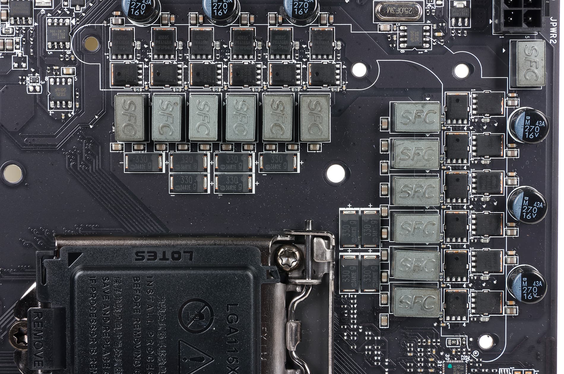 Система из двух связанных радиаторов расположена возле процессорного разъема и установлена на MOSFET-транзисторах регулятора напряжения питания процессора.