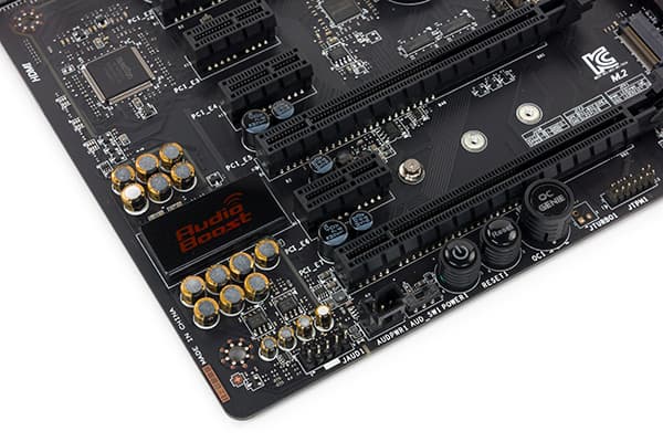 Аудиоподсистема материнской платы MSI Z97 Gaming 7 включает в себя популярный 8-канальный (7.1) HDA-аудиокодек Realtek ALC1150 (он закрыт металлическим кожухом). Кроме того, имеются два операционных усилителя OPA1652, а также высококачественные конденсаторы. Все элементы аудиотракта выделены в отдельную зону и физически изолированы на уровне PCB от других элементов платы. На задней панели платы предусмотрено шесть позолоченных аудиоразъемов типа миниджек (3,5 мм) и один оптический разъем S/PDIF (выход). Все это в совокупности имеет маркетинговое название Audio Boost.