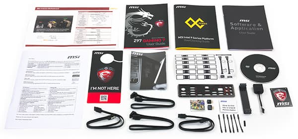 Комплектация платы MSI Z97 Gaming 7 довольно скромная. Кроме самой платы в картонной коробке поставляется инструкция пользователя (только на английском языке), отдельная инструкция по разгону (опять-таки на английском языке), DVD-диск с программным обеспечением и драйверами, четыре SATA-кабеля (все разъемы с защелками, два кабеля имеют угловой разъем с одной стороны), заглушка задней панели платы, мостик SLI, специальный переходник с MOLEX-разъема на разъем питания аудиотракта (Audio Power Adapter), а также V-Check Cable x6 — наборный кабель из шести отдельных проводков, которые подключаются к контрольным измерительным точкам (V-Check) на плате и предназначены для упрощения процесса измерения напряжений в контрольных точках.