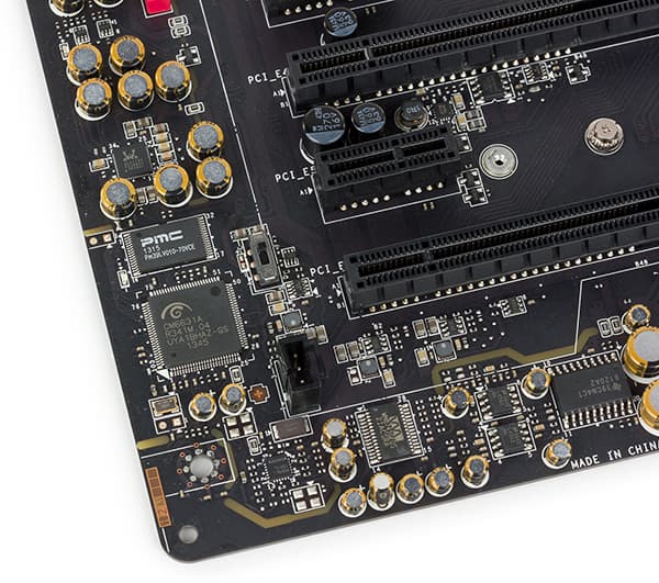 Начнем с того, как решается проблема нехватки портов PCI Express 2.0. Для увеличения портов PCI Express 2.0 на плате применяется дополнительный коммутатор ASMedia ASM1184e на пять портов PCI Express 2.0. То есть используя на входе один порт PCI Express 2.0, коммутатор ASMedia ASM1184e предоставляет на выходе еще четыре порта PCI Express 2.0. Таким образом, с учетом коммутатора ASMedia ASM1184e получаем, что на плате имеется 11 (7+4) портов PCI Express 2.0, то есть понятно, что портов PCI Express 2.0 вполне достаточно для реализации всех слотов и контроллеров.
