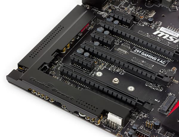 Аудиоподсистема материнской платы MSI Z97 Gaming 9 AС очень продвинутая и занимает довольно много места. Все элементы аудиотракта закрыты металлическим кожухом. Под этим кожухом скрывается довольно много микросхем. Это и 8-канальный (7.1) HDA-аудиокодек Realtek ALC1150, и USB-аудиопроцессор C-Media CM6631A с поддержкой ASIO 2.2. Кроме того, имеется и отдельный ЦАП Wolfson WM874, а также два спаренных операционных усилителя L4562MA (Texas Instruments) и выделенный усилитель для наушников Texas Instruments TPA6120A2, что позволяет подключать к плате профессиональные наушники с сопротивлением до 600 Ом. За аналого-цифровое преобразование отвечает чип Cirrus Logic CS5346. Ну и конечно же, используются японские конденсаторы Nichicon. Все элементы аудиотракта выделены в отдельную зону и физически изолированы на уровне PCB от других элементов платы. Фактически, можно говорить о том, что на плате MSI Z97 Gaming 9 AС просто распаяна, ну если не High-End, то довольно приличная звуковая карта.