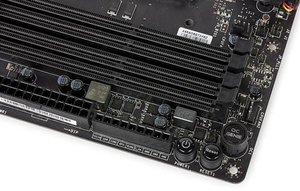 Имеется на плате и кнопка OC Genie, предназначенная для автоматического разгона системы. При ее нажатии в выключенном состоянии системы при загрузке произойдет автоматический разгон процессора. В качестве примера укажем, что с помощью кнопки OC Genie процессор Intel Core i7-4790K разгоняется до частоты 4,4 ГГц.
