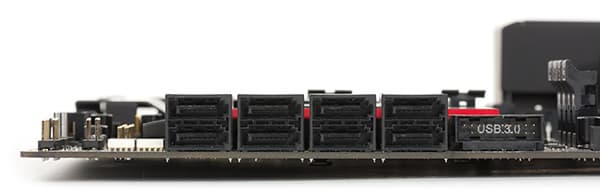 Для подключения всевозможных периферийных устройств на плате предусмотрено в совокупности двенадцать портов USB 3.0 и шесть портов USB 2.0.