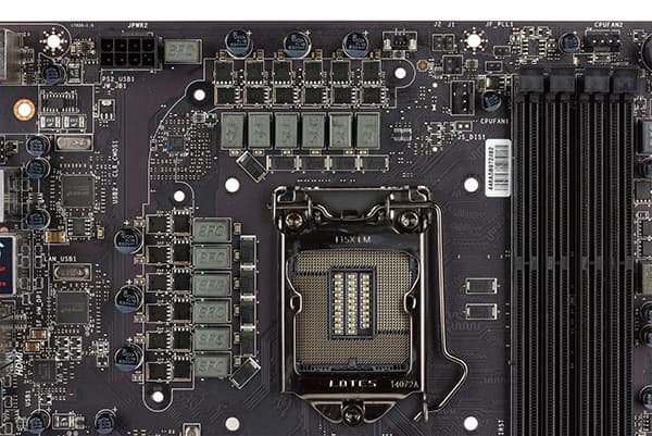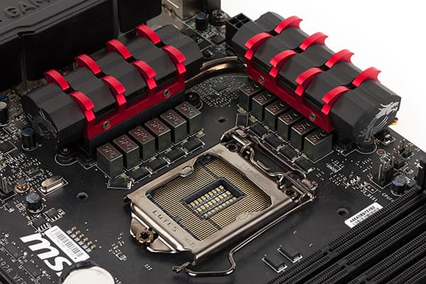 Система из двух связанных радиаторов расположена возле процессорного разъема и установлена на MOSFET-транзисторах регулятора напряжения питания процессора.