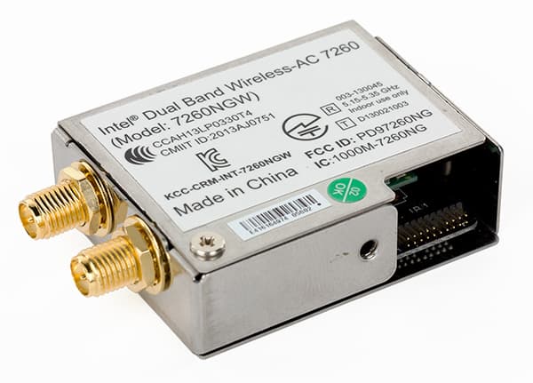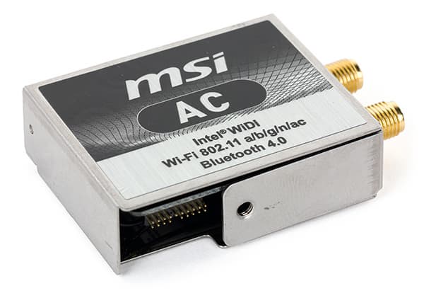 Кроме того, на плате имеется еще и модуль беспроводной связи на базе контроллера Intel Dual Band Wireless-AC 7260 (он вставляется в специальный разъем). Это двухдиапазонный (2,4 и 5 ГГц) модуль с поддержкой стандартов 802.11a/b/g/n/ac. К модулю поставляется две антенны, а максимальная теоретическая скорость передачи для протокола 802.11ac составляет 867 Мбит/с. Данный модуль обеспечивает еще и Bluetooth 4.0 соединение.