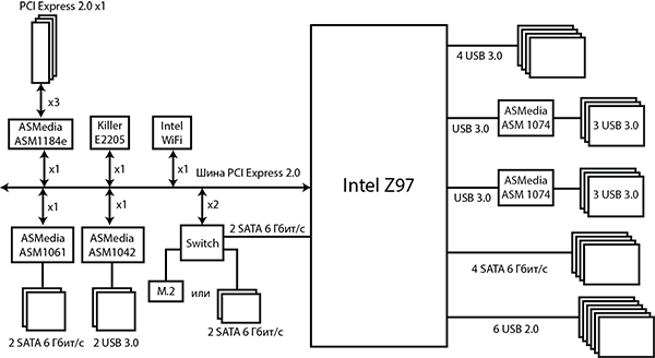 В предлагаемой схеме подключения 6 портов USB 3.0, 4 порта SATA 6 Гбит/с и 5 портов PCI Express 2.0 (два сетевых контроллера, коммутатор ASMedia ASM1184e, контроллеры ASMediа ASM1042 и ASMedia ASM1061) строго фиксированы. а вот еще два высокоскоростных порта переконфигурируемы и могут быть портами SATA 6 Гбит/с или PCI Express 2.0. Здесь все зависит от того, как используется разъем M.2.