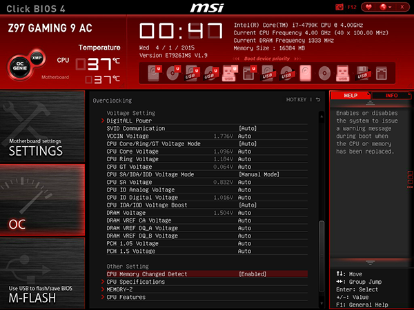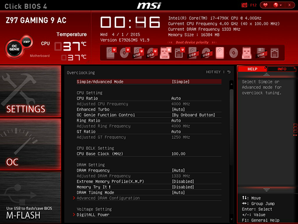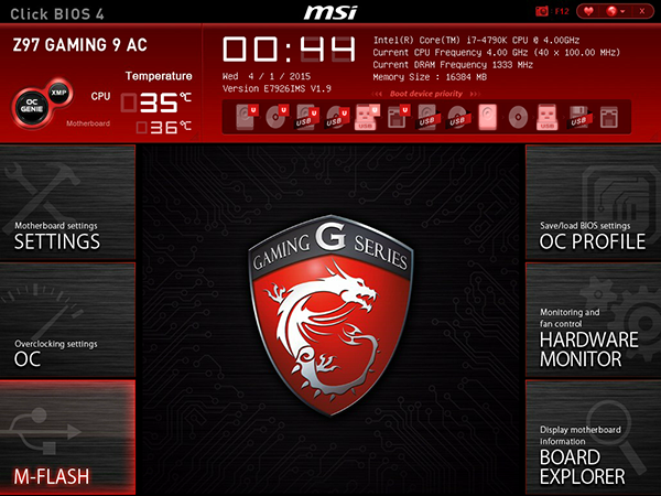 Собственно, UEFI BIOS на плате MSI Z97 Gaming 9 AC по своему интерфейсу и возможностям практически ничем не отличается от UEFI BIOS других игровых плат MSI на чипсете Intel Z97.