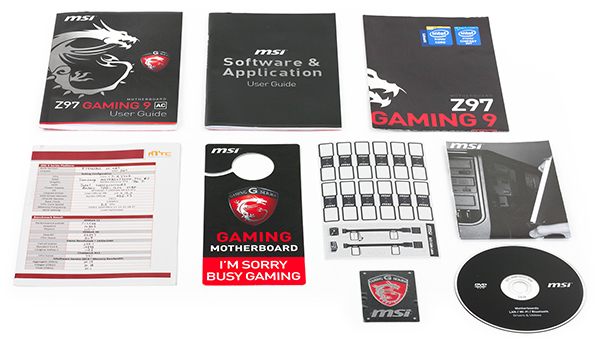 Комплектация платы MSI Z97 Gaming 9 AС довольно средняя. То есть это отнюдь не бюджетный вариант, но бывает и более богатая комплектация.
