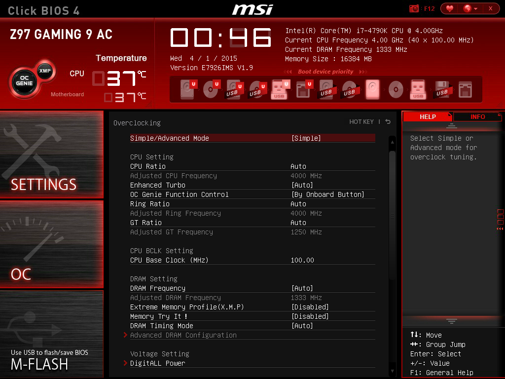 На главном экране выводится основная информация о плате, процессоре и оперативной памяти, а также данные о температуре. Есть меню выбора загрузочного устройства и кнопка OC Genie для быстрого разгона системы и кнопка XMP для активирования профиля памяти.