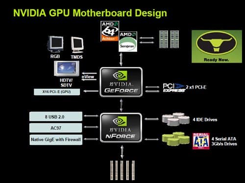Пополнением семейства прошедшей осенью стала одночиповая версия GeForce 6100, фактически функциональность nForce 410 с минимальными урезаниями (один канал PATA вместо двух) перенесли в северный мост. Частота графического ядра осталась прежней, убрана поддержка ТВ-выхода и сокращено число линий PCI Express, в результате nForce 405 поддерживает PCI Express x8 для видеокарты, а nForce 400 вовсе не предполагает наличия графического порта. Полученные гибриды смотрятся очень неплохо, как по себестоимости, так и по экономичности (и, как демонстрируют тесты первых системных плат на старшей одночиповой модели, тепловыделение оказывается ниже, чем у отдельного северного моста GeForce 6100, очевидно, повлияло удаление части линий PCI Express). Возможно, NVIDIA следовало применить более логичное наименование — GeForce 6000/6050, например, коль скоро южного моста в этих чипсетах не имеется, а поддержка PCI Express и раньше относилась к северному мосту. Но это мелкие придирки, а в целом, надо признать, что у данного решения почти нет прямых конкурентов, до сих пор все распространенные интегрированные решения для платформы AMD64 являлись двухчиповыми, что отрицательно сказывалось на дизайне платы (требовало более сложной разводки) и в конечном счете мешало дальнейшему снижению цен.