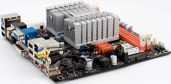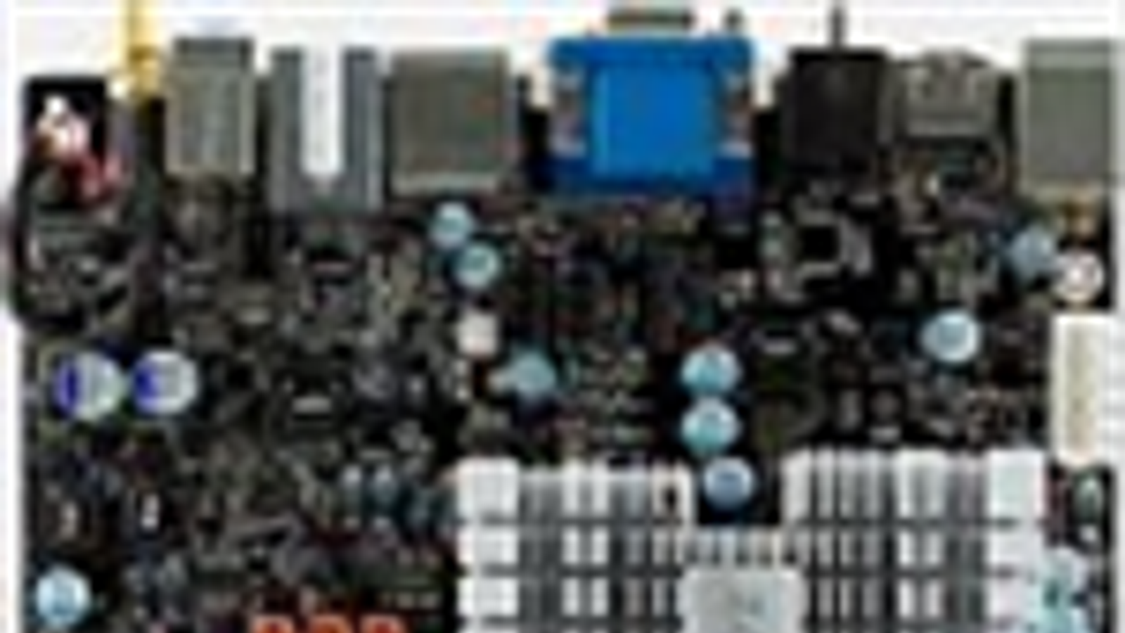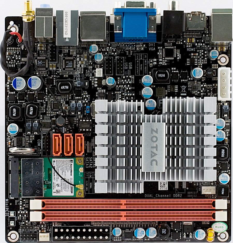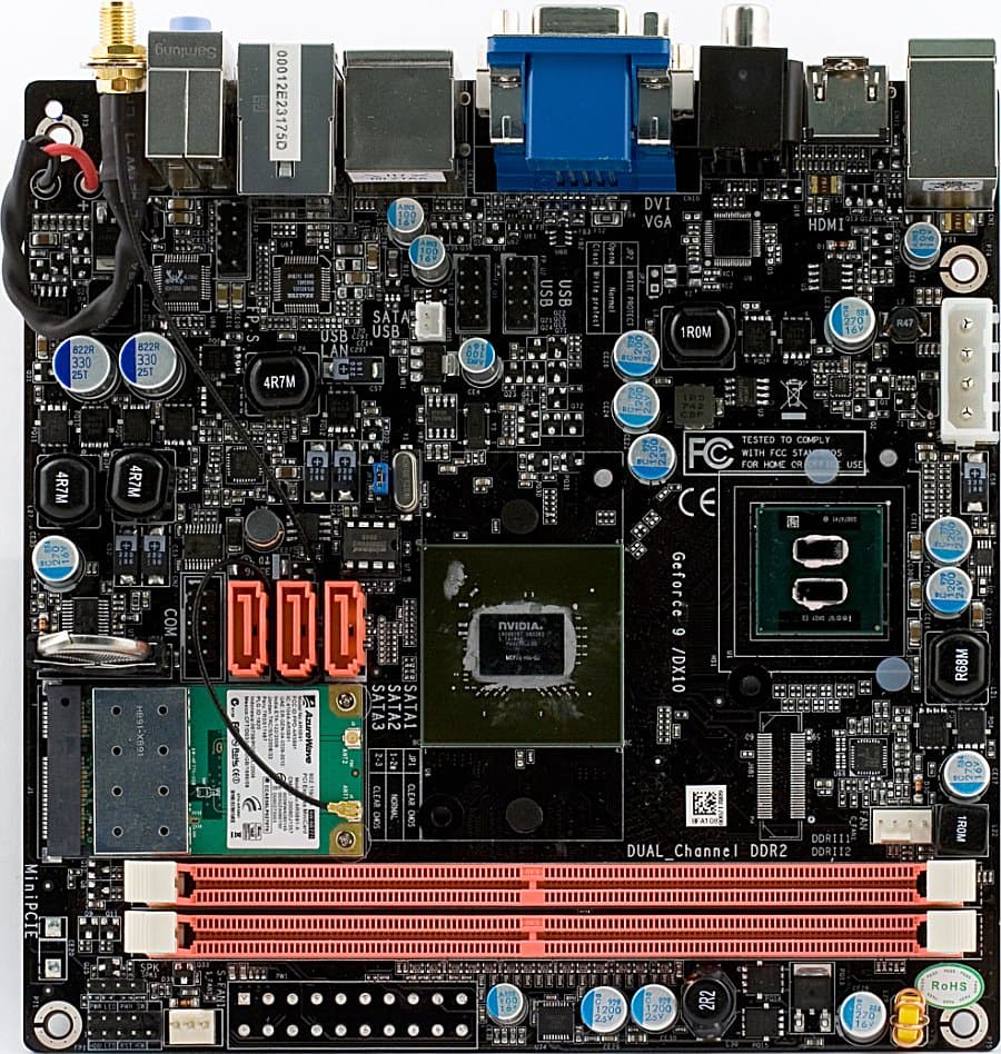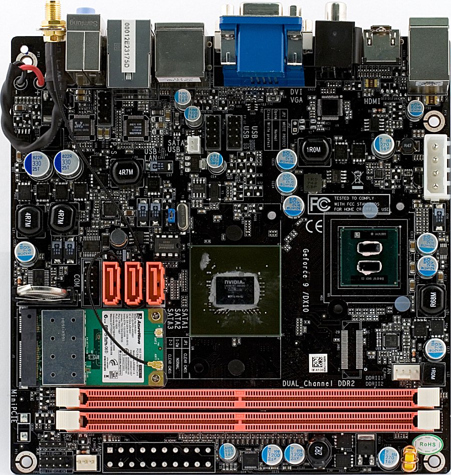 Еще раз повторим, что плата соответствует типоразмеру mini-ITX — 170×170 мм. Возможности конфигурирования у нее небогаты: процессор впаян, слот расширения всего один (mini-PCI-E), и в данном случае он занят модулем беспроводной связи. Удобно, что есть два стандартных слота для памяти DDR2, хотя модули SO-DIMM с начала современной экспансии ноутбуков успели подешеветь практически до своих аналогов типа DIMM, так что обошлись бы покупателю не намного дороже. При желании можно установить в плату до 4 ГБ памяти, причем работать она будет в двухканальном режиме — небольшая, но прибавка к скромной скорости работы. Также есть возможность подключить к плате до 3 SATA-накопителей, 4 USB-устройства, 1 COM-порт, 2 вентилятора и стандартные аудиоразъемы передней панели — вот, пожалуй, и все.