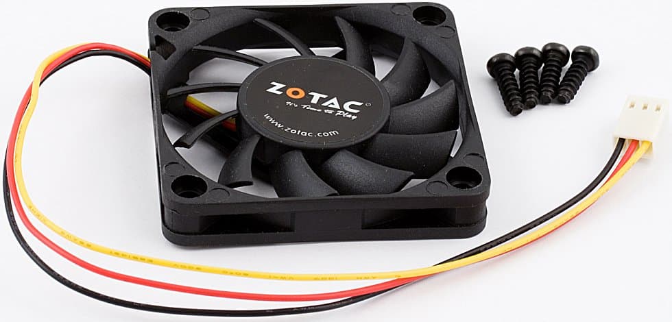 Вот за что нельзя не похвалить инженеров Intel — так это за комплексную проработку платформы. Даже в том случае, когда конечный продукт продается не под торговой маркой этой компании, все равно выпускается большое количество руководств по монтажу, эксплуатации и пр. для всех компонентов. В данном случае NVIDIA ограничивается тем, что отдает проектирование системы охлаждения на откуп партнерам, продающим конечный продукт. В Zotac же не стали слишком затруднять себя разработкой дизайн-гайдов, а просто предложили покупателю самому решать, нужно ли ему активное охлаждение на плате в его конкретных условиях. На случай, если таковое будет сочтено необходимым, в комплекте с платой поставляется небольшой вентилятор, легко монтируемый на радиатор сверху. Точные характеристики вентилятора мы, к сожалению, привести не можем, укажем лишь на размер крыльчатки (диаметр 60 мм) и почти полную бесшумность (по нашей субъективной оценке) даже при вращении на максимальных оборотах.