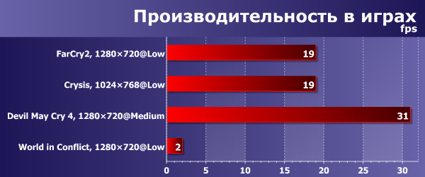 Еще раз подчеркнем, что это, конечно, далеко не все возможные варианты, но общее представление об игровой функциональности Ion получить можно. Самые современные игры запускаются без проблем (в отличие от ситуации с i945G), но играть можно либо в низких разрешениях, либо с серьезными тормозами. Хуже того, во многих случаях снижение настроек графики не поможет, так как скорость ограничена именно процессором: скажем, показатели платформы в FarCry2 при 640×480@Low отличаются всего на пару fps. Ну а фиаско в World in Conflict говорит само за себя.