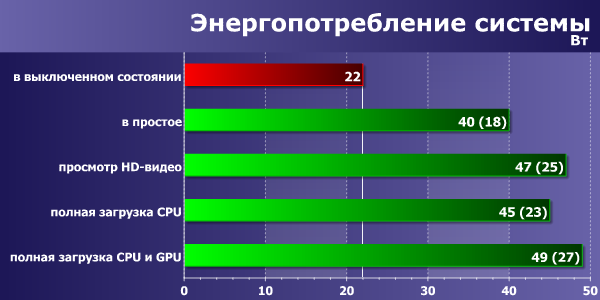 При оценке потребляемой такой системой мощности мы использовали измерения «из розетки», то есть включая собственное потребление/потери внешнего БП. «Чистое» потребление платы таким образом узнать нельзя, но его легко оценить примерно, полагая КПД блока питания приблизительно одинаковым на любой нагрузке. Тестировалась система в следующей конфигурации: в плату были установлены два модуля памяти DDR2-800, подключен винчестер 3,5″, мышь и клавиатура.
