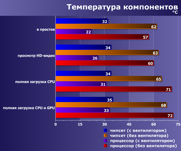 Так потребуется ли использовать комплектный вентилятор? Разнообразие корпусов, даже изначально заявляемых в качестве mini-ITX-решений, не позволяет дать однозначный ответ на этот вопрос. Приведем традиционный ориентир — температуру компонентов под нагрузкой в условиях открытого стенда. Показатели процессора не обязательно соответствуют реальной температуре ядер, так как их внутренний цифровой датчик выдает лишь отрицательное смещение — разницу между текущей температурой и точкой перегрева, принуждающей срабатывать встроенную термозащиту процессора. Это, впрочем, совершенно непринципиально, а в стандартной форме мы приводим показатели исключительно для удобства сравнения, тем более что и предположительное значение TJ для Atom 230/330, и предельная температура MCP79/MCP7A совпадают — 90 °C. Указанные значения температуры процессора следует трактовать исключительно следующим образом: «72 °C» означает «18 °C до перегрева».