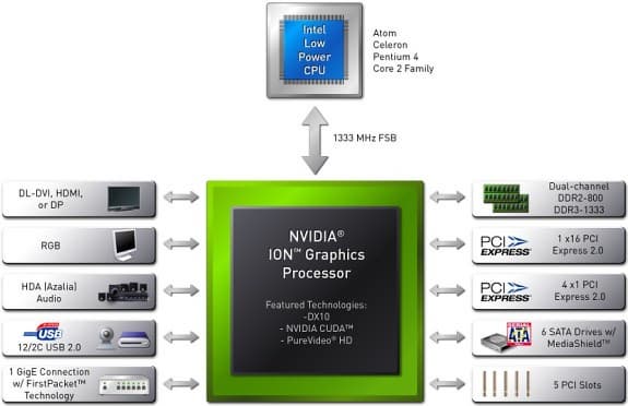 NVIDIA предпочитает называть чипсет, лежащий в основе платформы, тем же именем Ion. Однако по сути это настольный чипсет GeForce 9300/9400, реализующий следующую функциональность: