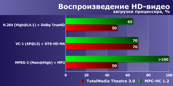 Любопытно, что провал наблюдается (у MPC) с декодированием MPEG-2. На этот формат слишком давно махнули рукой, посчитав, что его время ушло вместе с DVD Video, а вот современные применения MPEG-2 могут поставить неоптимизированный декодер (вроде старого встроенного в MPC) на колени. Конечно, в случае современных настольных процессоров это было бы всего лишь досадной недоделкой, а для воспроизведения хватило бы и «чистой» процессорной мощности, но тут вмешивается специфика Atom. К счастью, встроенные декодеры «больших» плееров полностью поддерживают возможности интегрированной графики, так что аппаратное ускорение отрабатывает без проблем.