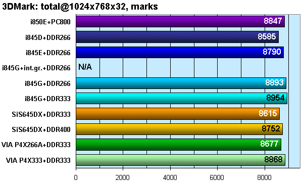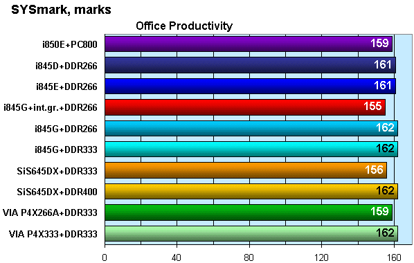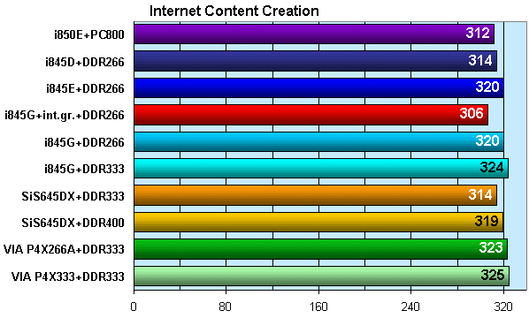Оба набора тестов SYSmark показывают, что среди сравниваемых систем нет ни явных лидеров, ни явных аутсайдеров. Заметно небольшое отставание i845G со встроенной графикой, но в силу специфики этих тестов 3-5% разницы результатов не только не имеют критического значения, но и вообще не будут замечены реальным пользователем в реальных приложениях исследуемого класса. Среди лучших опять VIA P4X333 и i845G.