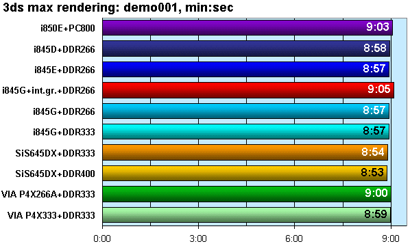 Рендеринг в 3ds max — и еще одна колонка ровных цифр, опять же с мизерным отставанием интегрированной видеосистемы i845G. Совсем неплохо для почти бесплатной видеокарточки!