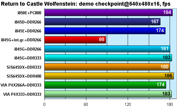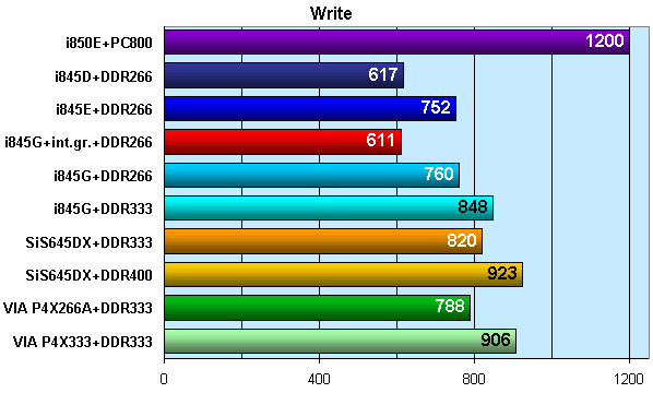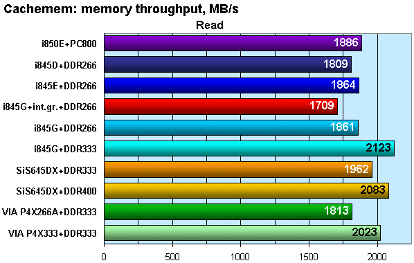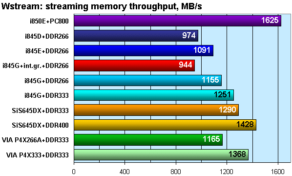 В низкоуровневых операциях чтения и записи в память звенит первый тревожный звоночек для интегрированной графики i845G — скорость работы с памятью ниже, чем у i845D, который на 10-20% отстает от своих собратьев с «ускоренным» Pentium 4. i845E и i845G подтверждают свою идентичность, при этом i845G в сочетании с DDR333 вырывается в лидеры по скорости чтения. Продукты же конкурентов лучше выглядят при записи, и пара SiS645DX+DDR400 и VIA P4X333+DDR333 показывает наилучшие результаты среди DDR-чипсетов (i850E выступает в отдельной лиге ввиду явного преимущества) по суммарной скорости низкоуровневой работы с памятью.
