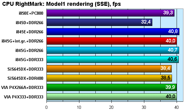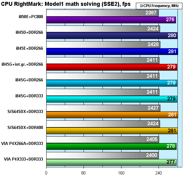 Еще один, последний раз мы убеждаемся, что скорость блока решения уравнений CPU RightMark не зависит от применяемого чипсета, а лишь слегка колеблется в соответствии с реальной частотой процессора на конкретной плате. В дальнейшем мы предполагаем использовать показатели этого модуля бенчмарка только для сравнения различных процессоров, включая, конечно, случаи моделей с различными поддерживаемыми наборами процессорных инструкций.