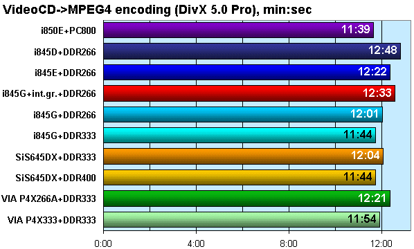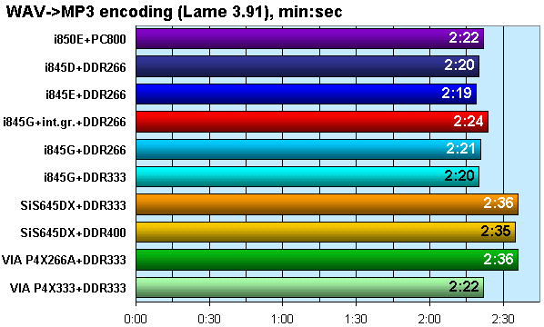 В кодировании MP3 на процессоре одной частоты все чипсеты примерно равны; отрадно, что VIA P4X333 примкнул к худшим из лучших, а не наоборот. :)