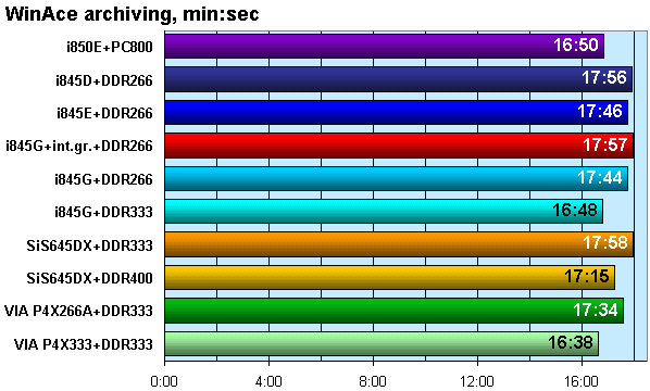 Ускорение процессорной шины немного помогает при кодировании MPEG4 и практически бесполезно при архивировании с помощью WinAce, где важнее скорость памяти. Видеокодирование за счет своей работы с графикой замедляет выполнение на i845G со встроенным ускорителем на 5%, оболочка же WinAce этого не требует. В целом, обе задачи показывают эффект от ускорения подсистемы памяти, и если потоковое кодирование MPEG4 все еще быстрее на i850E, то архивирование с большим словарем выводит в лидеры VIA P4X333 и i845G.
