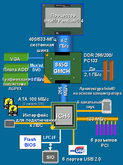 Вначале о том, почему представляются сразу два чипсета. Все просто: i845E — классический вариант чипсета, i845G — интегрированный.