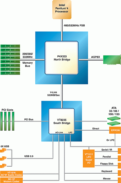 Как и ожидалось, к расширению функциональности и потенциальному увеличению потока данных от южного моста VIA приурочила расширение своей фирменной шины, связывающей ее северные и южные мосты — V-Link. Пропускная способность увеличена вдвое, до 533 МБ/с (данные передаются по шине с частотой 133 МГц, QDR), и теперь VIA по этому показателю сравнялась с SiS (MuTIOL) и вдвое превосходит Intel Hub-Link. В заключение имеет смысл упомянуть о том, что, как и все прочие мосты VIA, P4X333 совместим по разводке со своими предшественниками (P4X266, P4X266A), а VT8235 — с любым южным мостом своей серии (VT8233, VT8233С, VT8233A), что, теоретически, дает возможность производителям материнских плат выпускать продукты на новых чипсетах без затрат на переразводку платы.