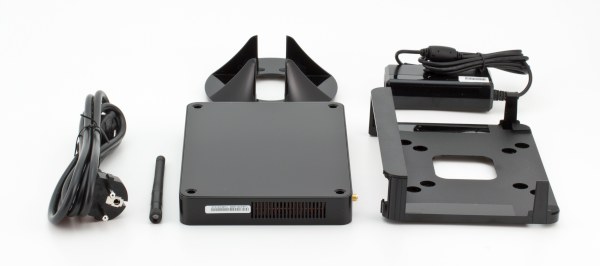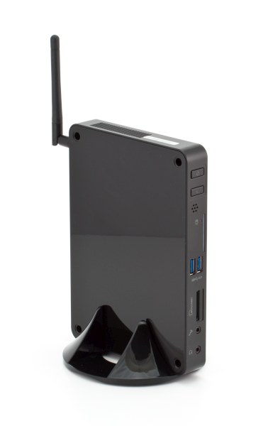 В комплекте есть подставка для традиционного вертикального расположения неттопа на столе, а также крепеж для установки на заднюю панель монитора с VESA-креплением.Также из коробки мы вытащили компактный и легкий 65-ваттный блок питания Hunt Key, антенну беспроводного адаптера и еще некоторую мелочевку вроде крепежных винтиков и переходника DVI—VGA.