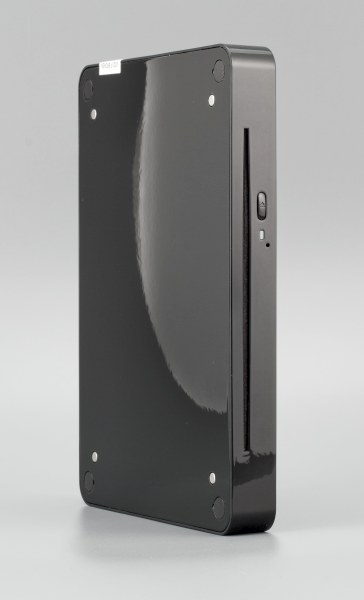 В качестве аксессуаров дополнительно можно приобрести пульт дистанционного управления, если планируется превратить неттоп в домашний медиацентр, а также оптический привод. Нам достался на тесты вариант с оптическим приводом. И надо сказать, несмотря на то что это низкопрофильный привод, рядом с неттопом он выглядит очень массивным дополнением. Хотя по дизайну он подходит, и забавно выглядит оригинальная конструкция подставки, позволяющая сблокировать оба устройства: просто поставить их рядом.