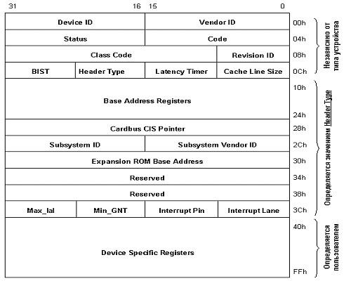 В заголовке содержится информация о производителе и типе устройства — поле Class Code (сетевой адаптер, контроллер диска, мультимедиа и т.д.) и прочая служебная информация.