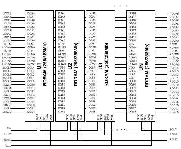 Собственно, сам интерфейс соединения контроллера с микросхемами памяти называется каналом или шиной RAMBus и включает в себя 18bit шину данных DQ(A,B)[8:0], подразделяющуюся на A и B байты, 3bit интерфейс управления строкой ROW[2:0], 5bit интерфейс управления столбцом COL[4:0], две дифференциальные синхропары CTM/CTMN и CFM/CFMN, два высокоскоростных CMOS-сигнала управления SCK и CMD, и низкоскоростной интерфейс инициализации SIO[1:0]. Таким образом, канал RAMBus является высококлассной соединительной структурой, ограниченной контроллером памяти с одной стороны и серией нагрузочных сопротивлений (терминаторов) — с другой. Кроме чего есть еще пять интерфейсов питания (VRSL, VCMOS, VTERM, VDD и VDDA), две разновидности линии «заземления» (GND/GNDa) и вывод подачи опорного напряжения (VREF — статический высокоомный, низкоамперный вход).