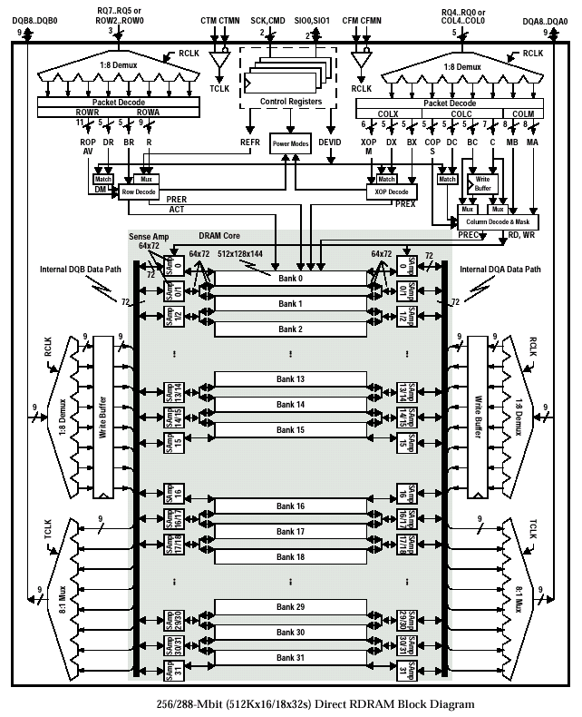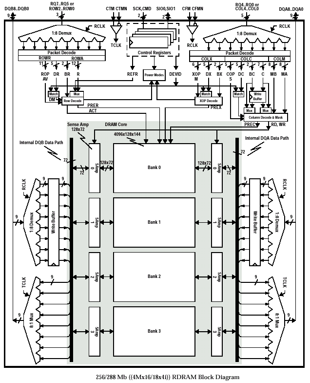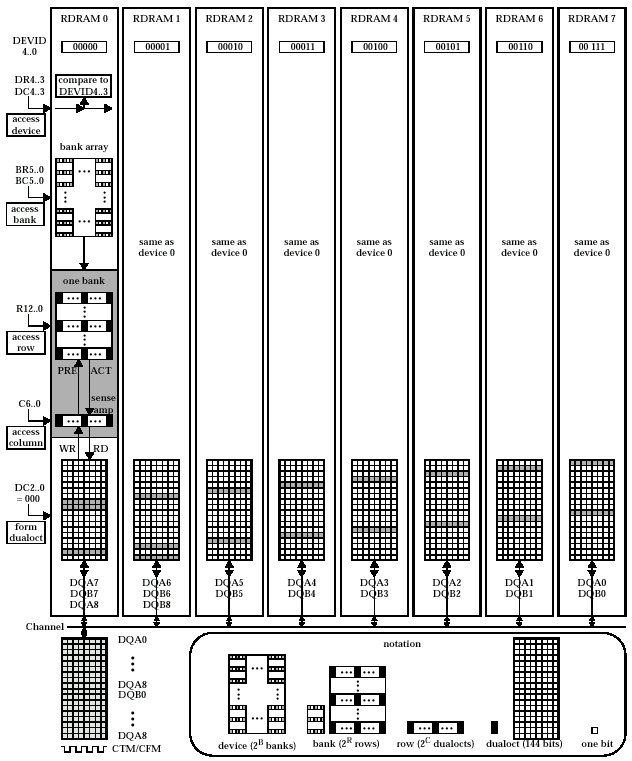 Логическая основа рассматриваемых устройств DRDRAM — это 32/36 MB ядро, поделенное на 32 банка по 512/576 KB для архитектуры 2x16d, и 256/288 Mbit массив, состоящий из 4 банков по 8/9 MB у 4i-микросхемы. В свою очередь, каждый банк 32s-архитектуры организован по 512 строк, каждая из которых содержит 128 dualocts, каждый из которых содержит 128/144 bit (16/18 байт) и является наименьшей «единицей» (частью) данных, которую можно адресовать и провести над ней необходимую операцию. Иными словами, размер dualoct (или «сдвоенный восьмибайтник», размер одного oct составляет 8 байт) равен ширине интерфейса коммуникации между логическим банком и соответствующим ему усилителем уровня (внутренняя DQA/DQB шина данных): 2х 8 байт при стандартном 16bit внешнем интерфейсе микросхемы, или 2х 8 байт, плюс 2 дополнительных байта ЕСС кода (обусловлено уникальностью подхода реализации применяемого в DRDRAM механизма коррекции ошибки) у микросхемы памяти с 18bit шиной данных. В результате организацию ядра микросхемы памяти с внутренней структурой 32s можно описать по схеме 32x{512x128x128} для 256Mbit прибора и 32x{512x128x144} — для 288Mbit устройства. Каждый банк 4i-архитектуры организован по 4096 строк, каждая из которых содержит 128 dualocts (ширина внутренней шины данных у рассматриваемых архитектур одинакова и составляет 128/144 bit для 16/18 bit внешнего интерфейса). Таким образом, организацию ядра микросхемы памяти со структурой 4i можно описать как 4x{4096x128x128} для 256Mbit прибора и 4x{4096x128x144} — для 288Mbit устройства.