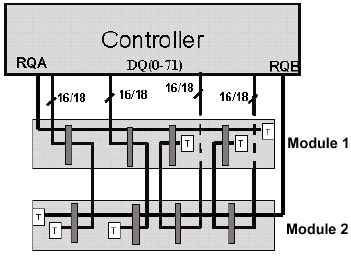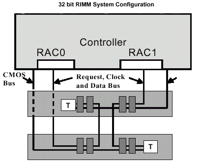 Для обслуживания 64bit модулей должен применятся контроллер с соответствующим количеством каналов, управляемых определенным числом RAC в зависимости от реализации. Например, RMC может быть спроектирован таким образом, чтобы осуществлялась поддержка как 64bit модулей, так и RIMM с 16bit интерфейсом — такого рода управляющее устройство обеспечивает максимальную гибкость и, думается, не лишнюю обратную совместимость.