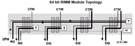 В системе, использующей 16bit RIMM, структура шин запроса и данных идентична и имеет «сквозной» роутинг — весь высокоскоростной интерфейс начинается от контроллера, проходит через все имеющиеся разъемы и модули, и заканчивается на серии нагрузочных сопротивлений. Пара CTM формируется задатчиком синхросигнала DRCG от дальнего конца структуры и распространяется по направлению к контроллеру, где разворачивается и становится парой CFM. Синхросигнал CFM, в свою очередь, распространяется в направлении движения сигналов командно-адресной шины от контроллера и терминируется по выходу из последнего разъема. Таким образом обеспечивается согласование и все сигналы поглощаются нагрузкой в самом конце структуры лишь после того, как проходят все модули.