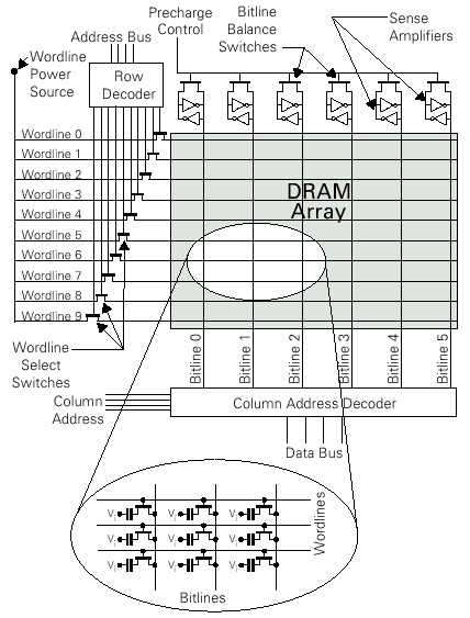 В современных микросхемах ДОЗУ матрица ячеек (основа ячейки — транзистор и конденсатор), составляющая ядро микросхемы, делится на несколько суб-матриц, называемых логическими (внутренними или архитектурными) банками (Bank). Такая иерархия преследуют две цели: позволяет производить операции фрагментации над резервируемыми (Redundant) с целью устранения возможных дефектов, возникающих при производстве (RMD — Repaired of Manufacturing Defects), составляющими ядра массива — строки (Word Lines), столбцы (Bit Lines или Data Lines) или отдельные ячейки (Individual Cells), — а также повышать производительность устройства одновременным выполнением совместных операций (Concurrent Operation) и разделением циклов регенерации (конвейеризация), делая их «прозрачными» относительно системы. Банки ядра соединяются внутренней шиной кристалла со специальными электрическими схемами-накопителями, именуемыми усилителями уровня (Sense Amplifier или SenseAmp), которые сохраняют данные одной строки логического банка на период проведения регенерации ее содержимого. Так, усилители уровня занимают намного большую площадь, чем сами ячейки памяти, и располагаются в непосредственной близости от столбцов ассоциируемых с усилителем логических банков, соединяясь с ними внутренней шиной данных.