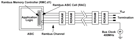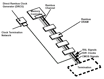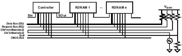 Рассматриваемая высокоскоростная RSL-структура состоит из сигнальных линий, начинающихся от контроллера, проходящих через все микросхемы памяти, и заканчивающихся на серии терминаторов. Нагрузочные сопротивления, в свою очередь, служат для согласования полного сопротивления шины, к которой подключены устройства — иными словами, сопротивление нагрузки должно быть равно сумме сопротивления источника и сигнальной линии. В результате, согласование достигается благодаря резистору, смещающему логический уровень на величину VTERM.