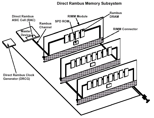 В 1999 году корпорация Rambus анонсировала новую технологию динамической памяти — Direct Rambus DRAM (DRDRAM), — позволяющей восьмикратно повысить пиковую пропускную способность относительно повсеместно доминирующего в то время PC100 SDRAM при условии равной ширины шины данных этих двух интерфейсов. Тем не менее, первым шагом молодой технологии был всего лишь модуль RIMM с 16bit шиной данных. Как и предыдущие технологии динамической памяти, Rambus DRAM также двигается параллельными путями, постепенно увеличивая пропускную способность расширением внешнего интерфейса, однако при этом не вводя кардинальных изменений в сами устройства динамической памяти (микросхема DRDRAM) и интерфейс коммуникаций с контроллером. Поскольку в основе данной технологии лежит концепция канальной иерархии, интерфейс можно расширять просто объединяя между собой несколько каналов — в результате делается возможным создание 32bit и даже 64bit модулей RIMM.